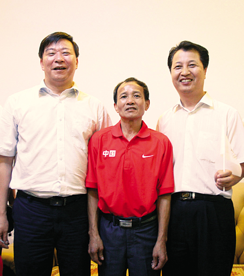 8月11日晚,張湘祥的父親張雨和(中)穿著張湘祥參加悉尼奧運會的服裝,與壽險福建龍巖 中心支公司前來道賀的領導合影留念,共同分享張湘祥奪冠的喜悅。