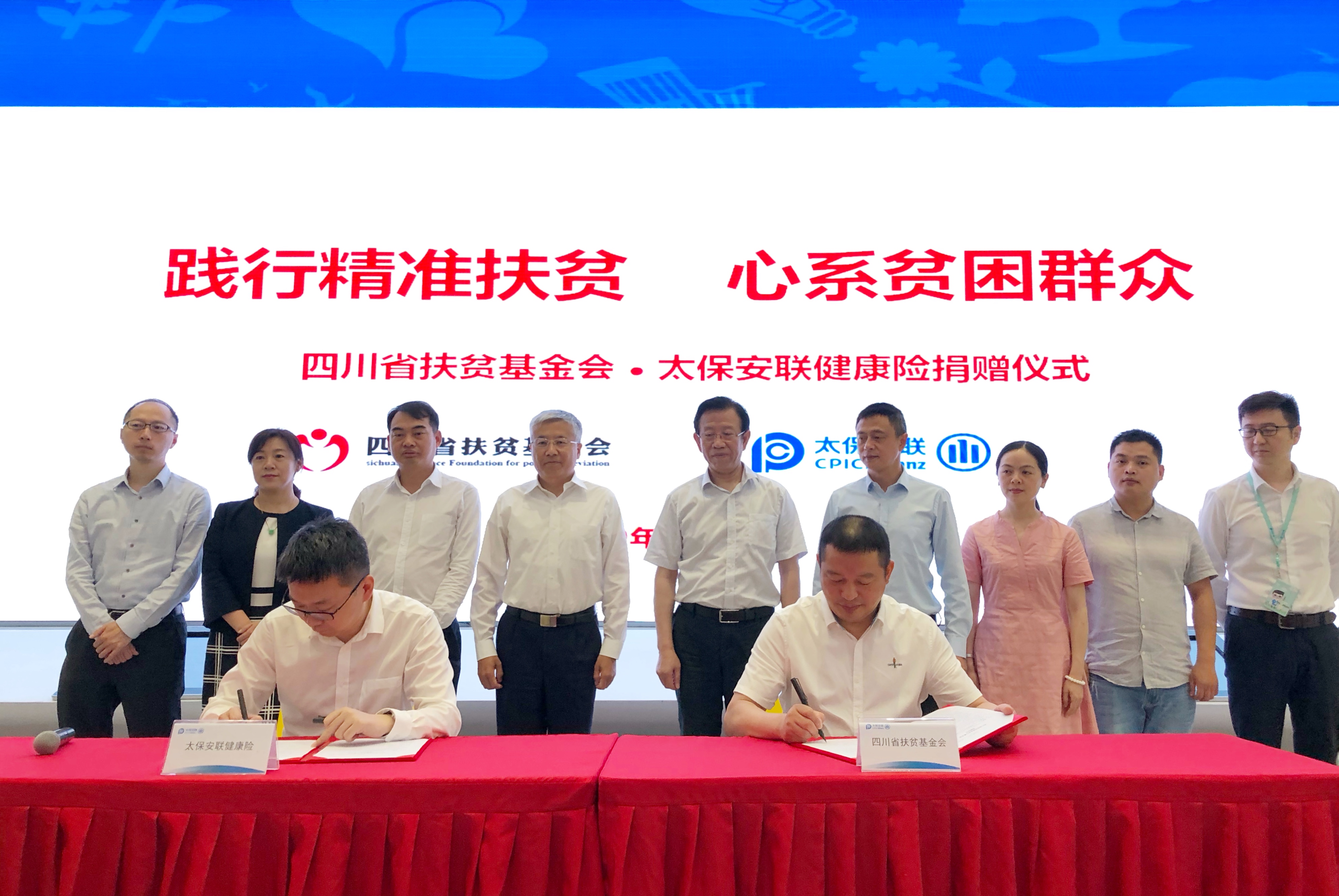 6月20日,中國太保集團旗下專業健康險公司太保安聯與四川省扶貧基金會在成都聯合舉辦扶貧捐贈簽約儀式。本次捐贈款將用于為四川貧困地區共計13857名已建檔立卡的貧困人口購買團體意外傷害保險,捐贈所涉保額近7億元。