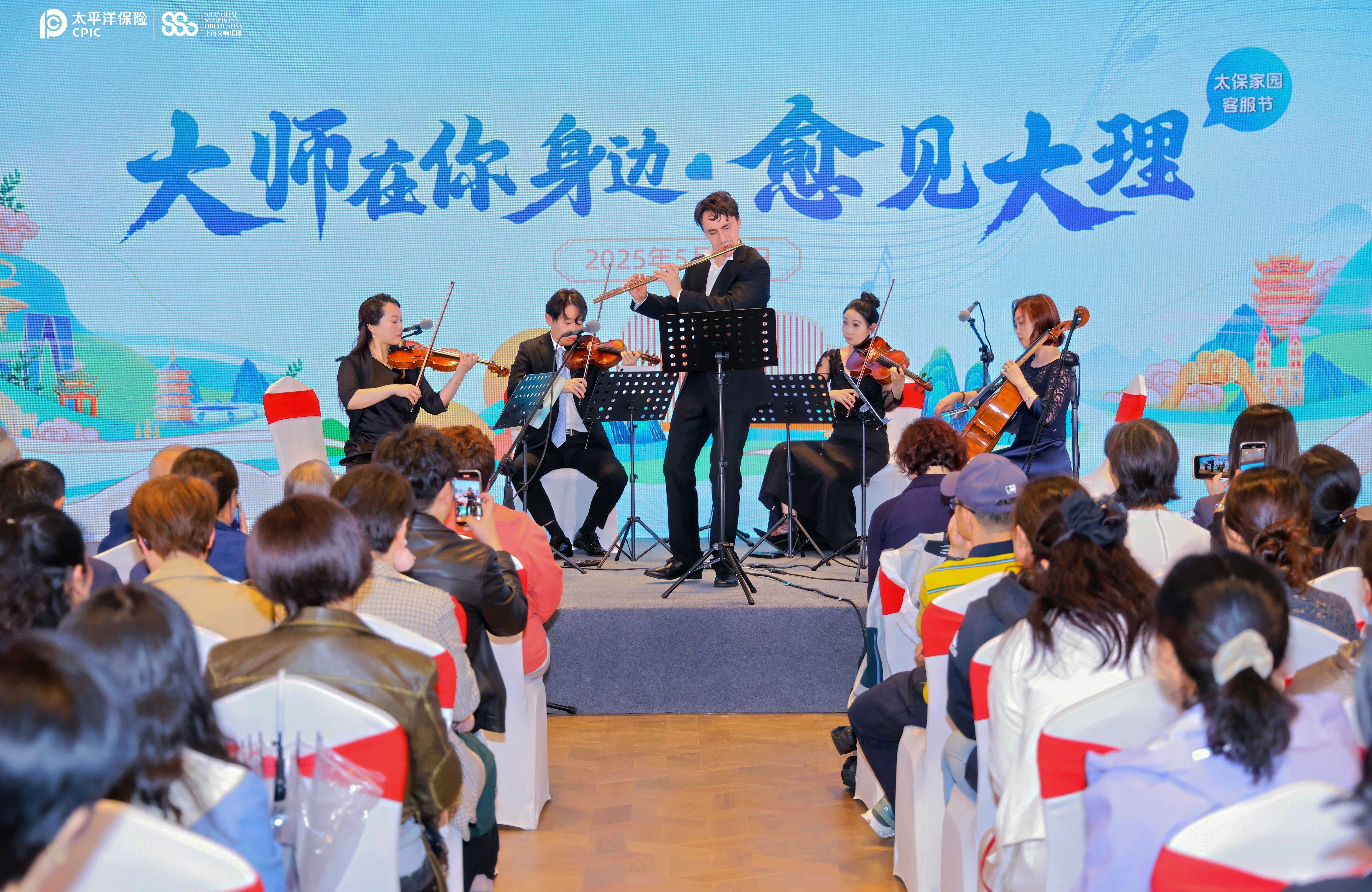 當(dāng)日晚間,一場“愈見大理·落日音樂會”作為此次客戶服務(wù)節(jié)啟幕活動的壓軸驚喜浪漫上演。特邀而來的上海交響樂團東海岸重奏組的藝術(shù)家們,在精彩演繹了莫扎特、巴赫等音樂巨匠的經(jīng)典曲目外,還特地為現(xiàn)場觀眾們帶來了《云南民歌五首》等特別編排的曲目。本場音樂會不僅僅是一場高雅的藝術(shù)表演,更是太保家園在探索高品質(zhì)養(yǎng)老服務(wù)道路上的又一次創(chuàng)新實踐。在去年,中國太保和上海交響樂團創(chuàng)新開啟了“音樂療愈合作計劃”,將古典音樂應(yīng)用到對認(rèn)知癥長者的照護中。在今年5月13日中國太?!肮嫒铡钡幕顒由希虾=豁憳穲F演奏家用大提琴講述了藝術(shù)家在養(yǎng)老院里為失智老人們演奏的故事。今日,東海岸重奏組也將這場心靈的對話進行了重現(xiàn),這曲圣桑的《天鵝》,仿佛治愈心靈繃帶,為現(xiàn)場所有人帶去無限慰藉。