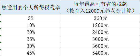 (2)抵扣額度:按實(shí)際存入金額抵扣,最高12000元/年。節(jié)稅金額直接取決于您適用的個(gè)人所得稅最高稅率,具體效果如下表所示: