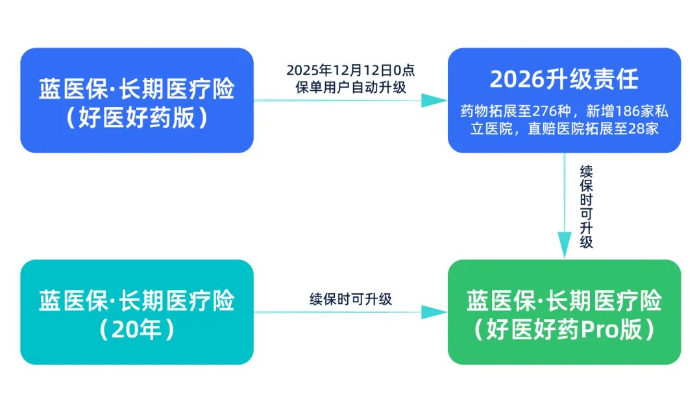 藍醫(yī)?!らL期醫(yī)療險(20年)和藍醫(yī)?!らL期醫(yī)療險(好醫(yī)好藥版)2款產(chǎn)品,滿足條件的保單用戶都可在續(xù)保時升級到藍醫(yī)?!らL期醫(yī)療險(好醫(yī)好藥Pro版)