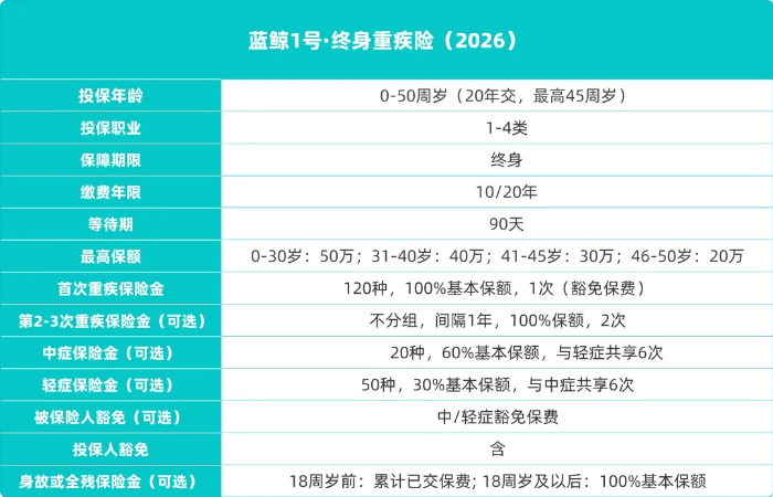 海豚君家的新品——藍(lán)鯨1號·終身重疾險(xiǎn)(2026),可以按需靈活定制,各項(xiàng)保障責(zé)任也很給力!