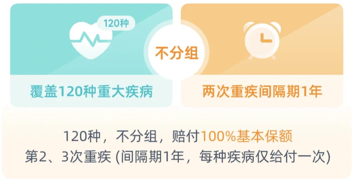 但藍(lán)鯨1號除了120種重疾的首次保障,還能選擇重疾二、三次賠,疾病不分組,間隔期僅1年。