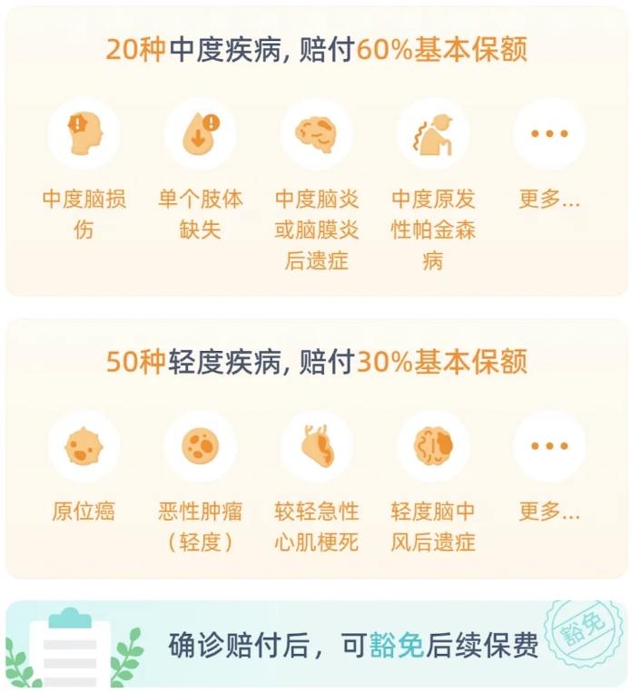 50種輕癥賠30%保額,20種中癥可賠60%保額,而且一旦確診后續(xù)保費(fèi)全部豁免,保障繼續(xù)有效,這個(gè)設(shè)計(jì)太人性化了!